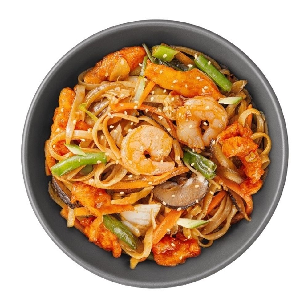Лапша удон, морковь, перец болгарский, фасоль стручковая, кунжут, лук зеленый,креветки, соус Устричный