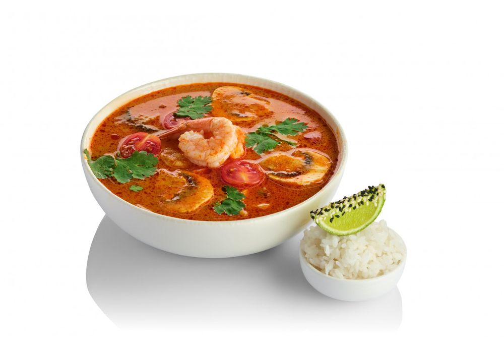 Креветки, шампиньоны, лист лайма, лемонграсс, лук красный, кокосовое молоко, томаты черри, лайм, рис, перец чили, кинза