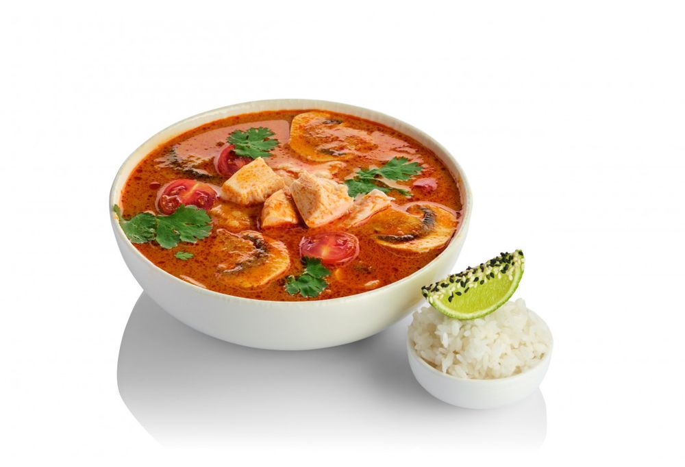 Курочка филе, шампиньоны, лист лайма, лемонграсс, лук красный, кокосовое молоко, томаты черри, лайм, рис, перец чили, кинза