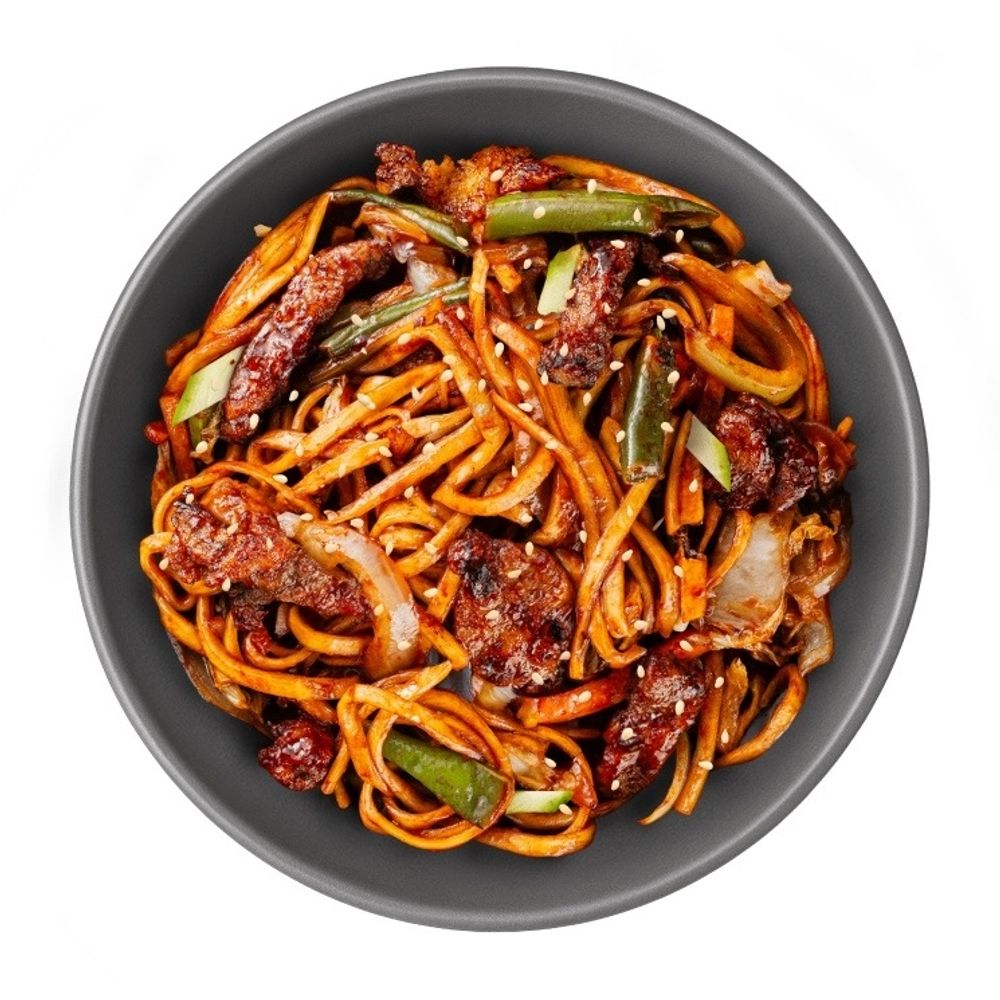 Удон, морковь, лук красный, перец болгарский, фасоль стручковая, шампиньоны, кунжут, лук зеленый, свинина, соус сладкий чилли.