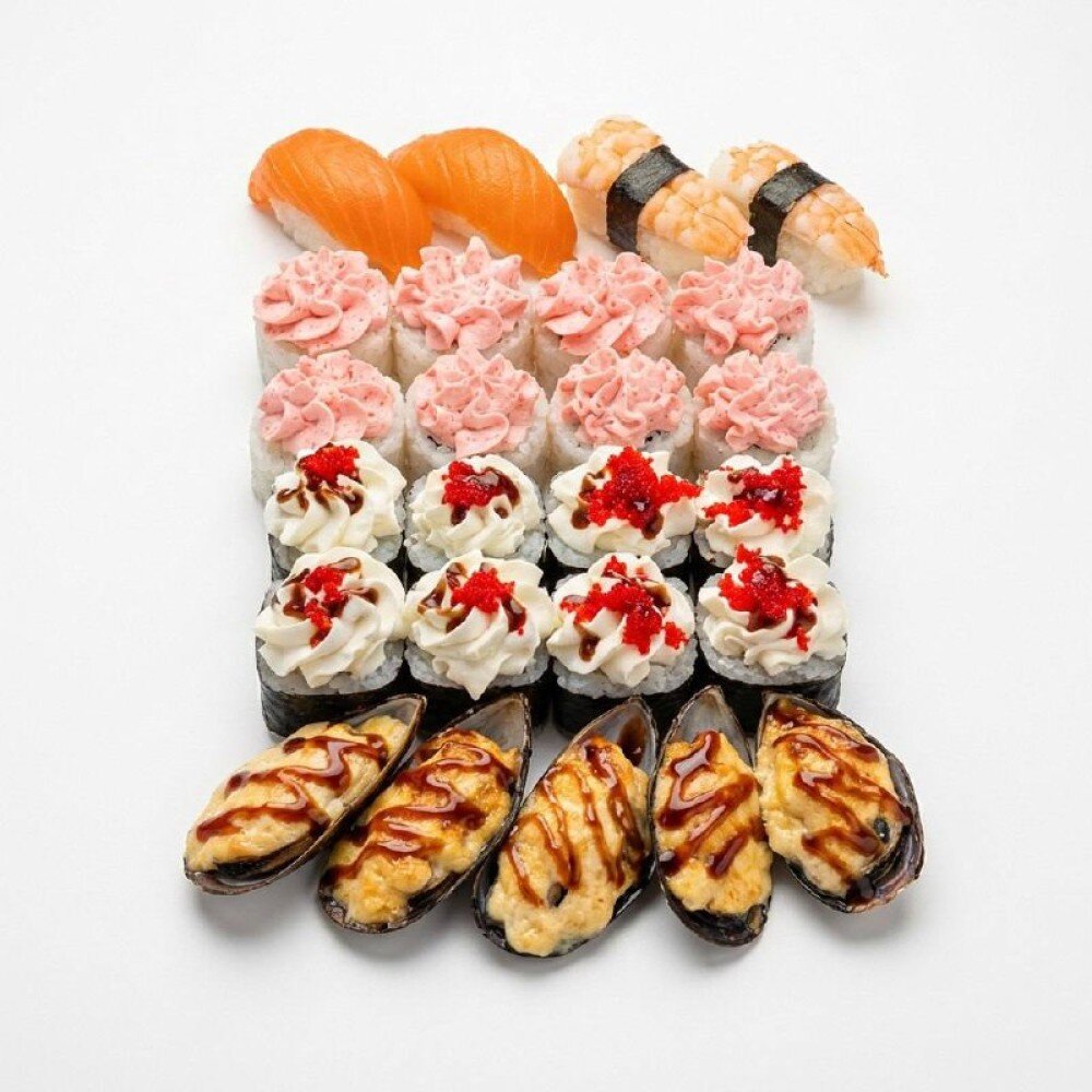 2 ролла 16 шт., 4 сушки, порция мидий 5 шт. Лава с креветкой, Суши с лососем 2 шт., Суши с креветкой 2 шт., Си маке с креветкой, Запеченные мидии с соусом Спайси и унаги.