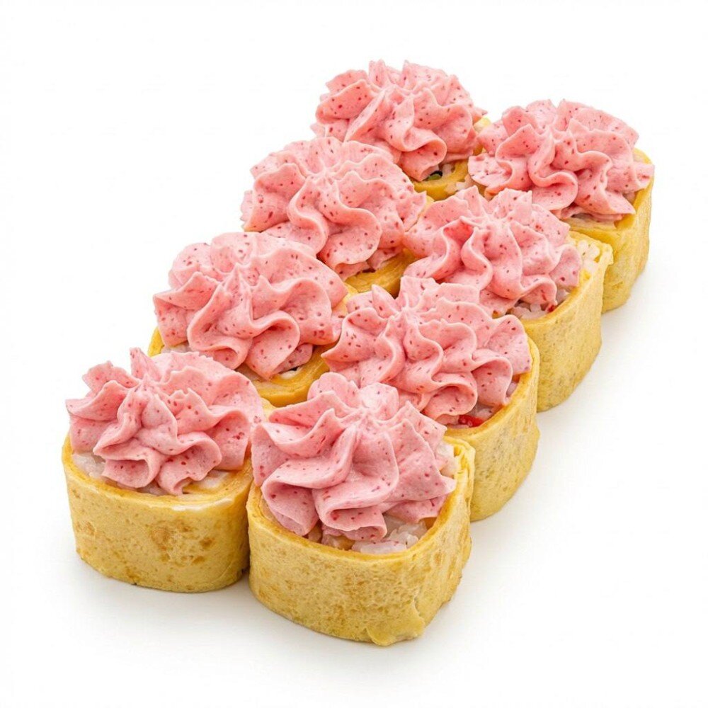 Ролл в мексиканской лепешке, сливочным сыром, Сурими (имитация снежного краба), огурцом и помидором, Украшен соусом Лава на основе Сливочного сыра, майонеза, масаги.