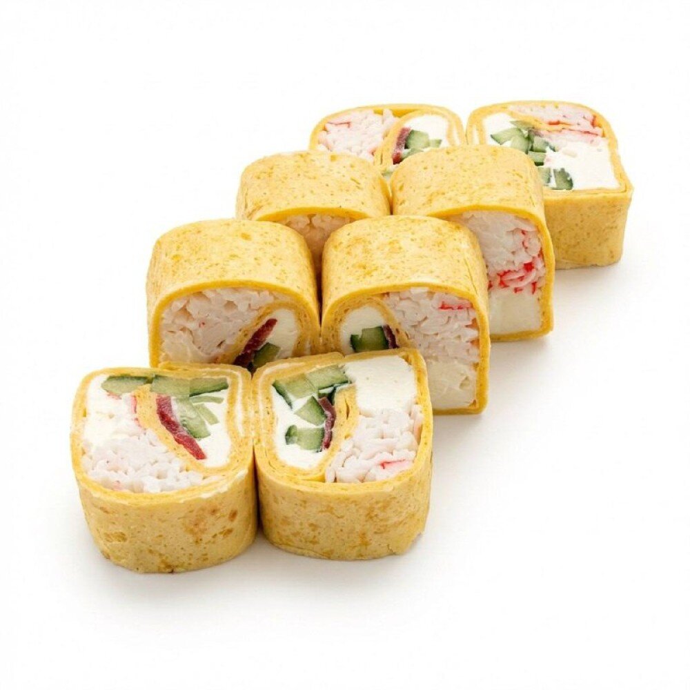 Ролл в мексиканской лепешке, сливочным сыром, Сурими (имитация снежного краба), огурцом и помидором.