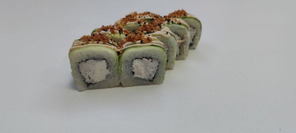 Рис, нори, Сурими (имитация снежного краба), сыр сливочный, обернут слайс огурца, украшен лук фри и полит соусом цезарь.