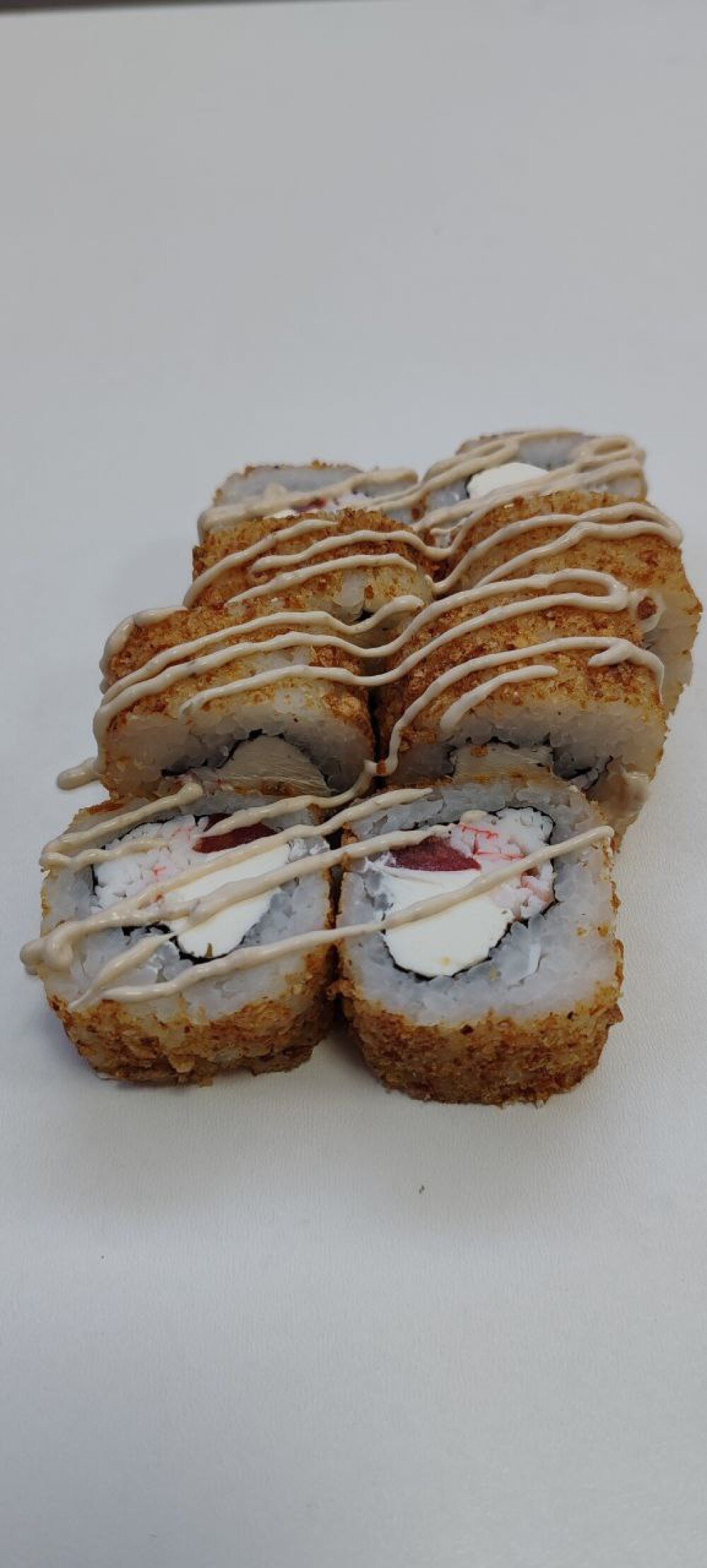 Рис, нори, сыр сливочный, Сурими (имитация снежного краба), помидор, обернут в лук фри, украшен соусом цезарь.