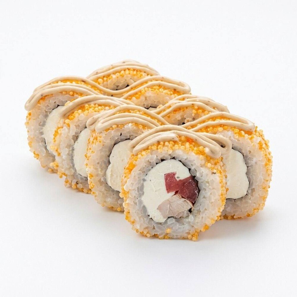 Рис, нори, сыр сливочный, курица х/к, помидор, обвален в воздушный рис, полит соусом цезарь.