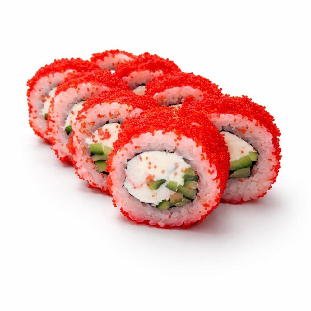 Нори, рис, сурими (имитация снежного краба) огурец, майонез, икра масага.