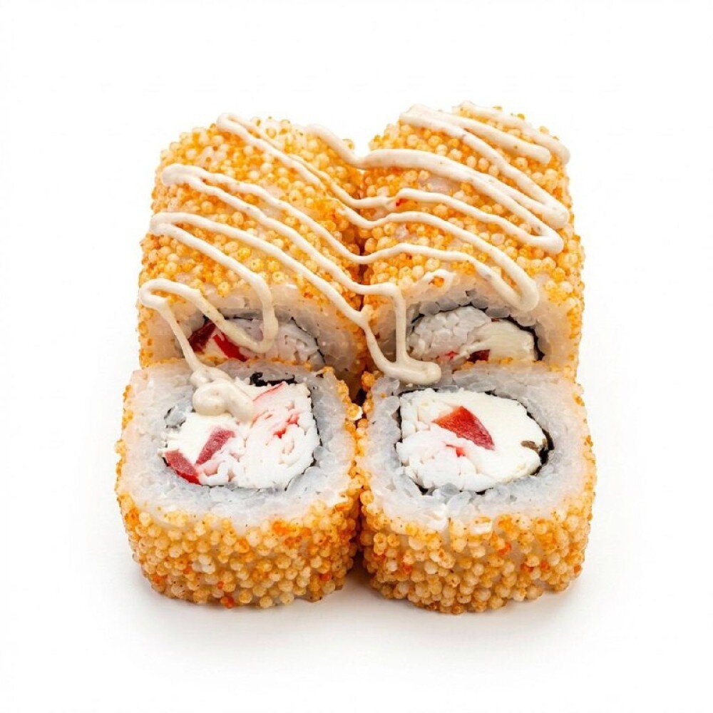 Рис, нори, сыр сливочный, Сурими (имитация снежного краба), помидор, обвален в воздушный рис, полит соусом цезарь.