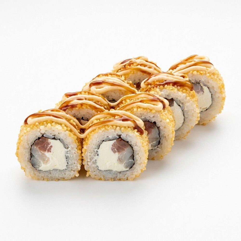 Рис, нори, сыр сливочный, креветка, помидор, обвален в воздушный рис, полит соусом спайси и соусом унаги.