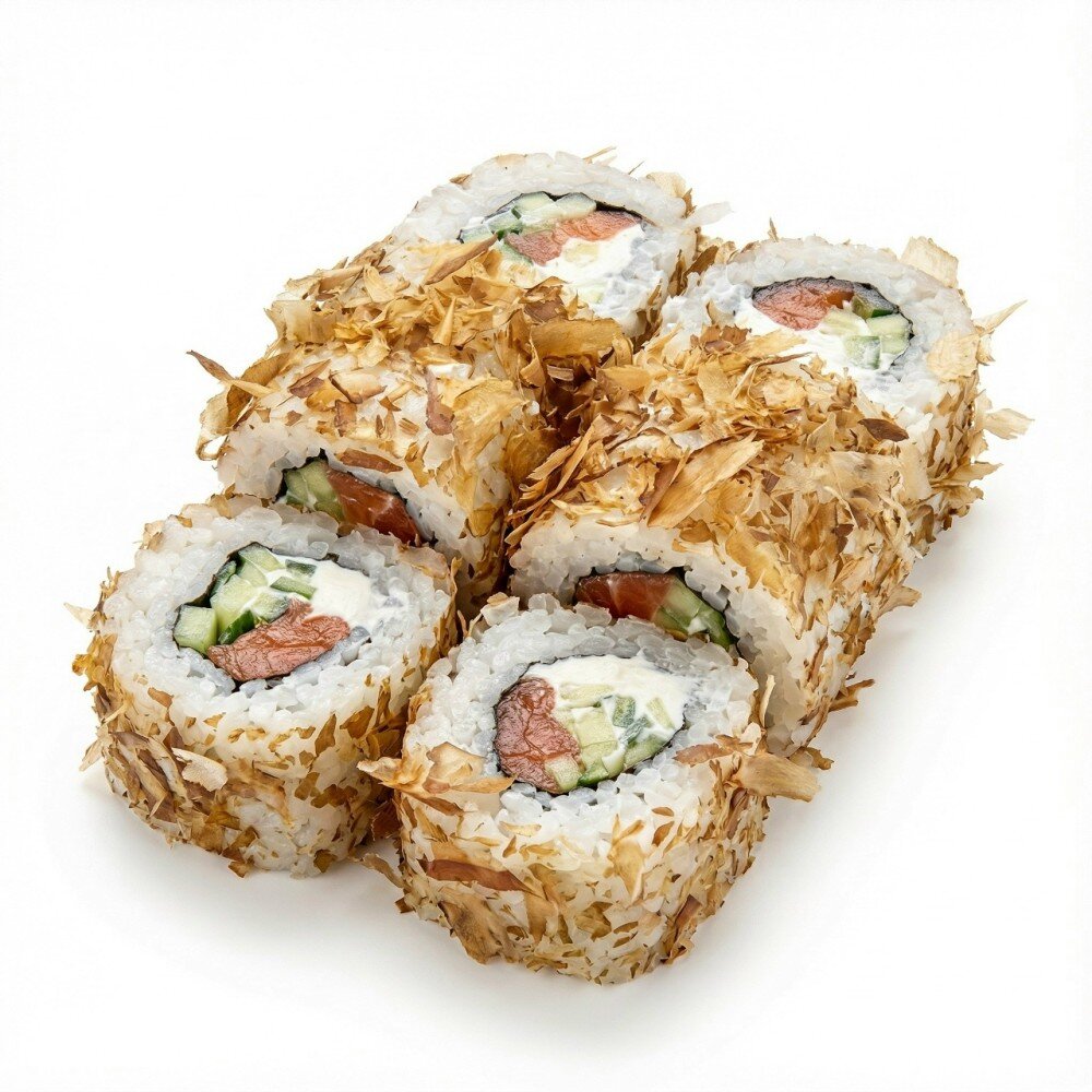 Состав: Ролл с лососем , огурцом и сливочным сыром. Обвален в стружке тунца.