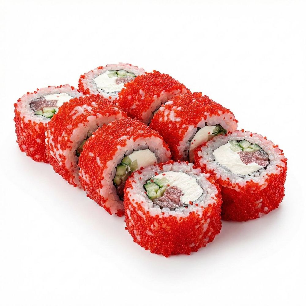 Рис, нори, сыр сливочный, икра масага, огурец, тунец копченый.