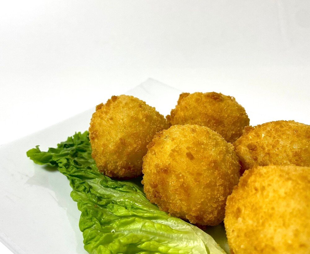 Обжаренные в сухарях шарики с тигровой креветкой, полит соусом Манго-чили.