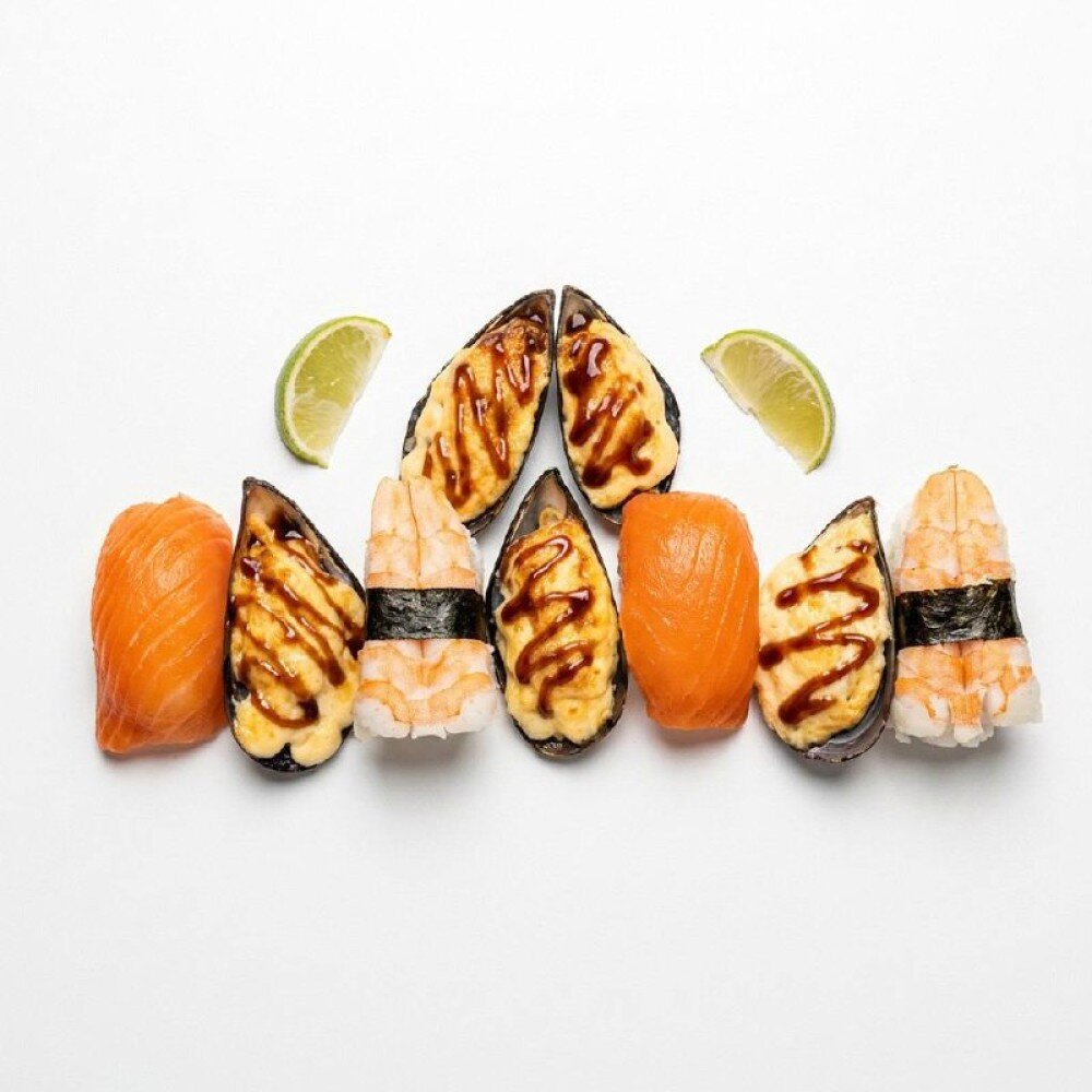 Состав: суши с креветкой 2 шт , суши с лососем 2 шт , запеченные мидий с соусом унаги и сыром пармезан .