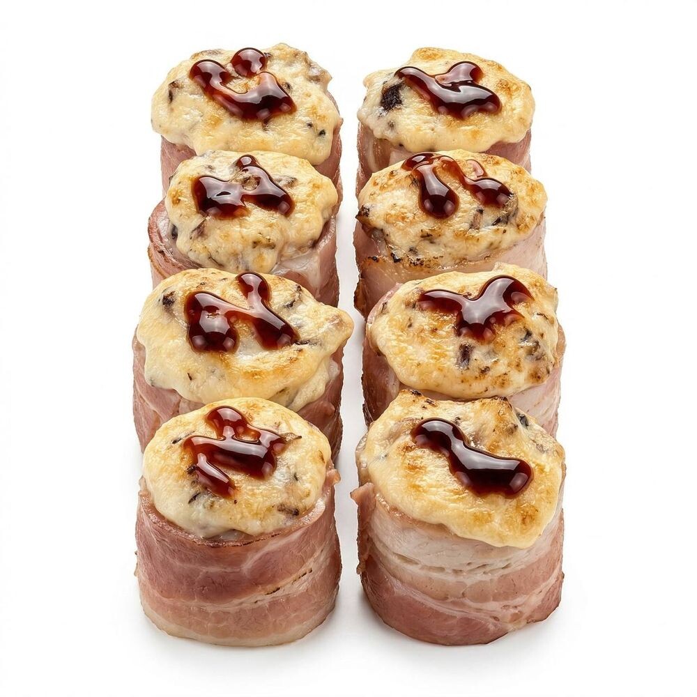 Состав: рис ,нори ,сыр сливочный ,бекон ,помидорка , шапка сырная с грибами шиитаке ,соус унаги