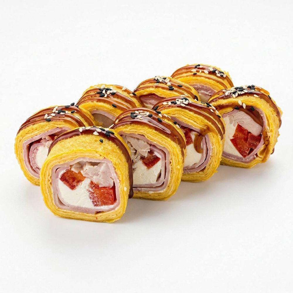 Состав : тортилья сырная , сыр сливочный , бекон ,курочка хк, помидор ,соус ширачи