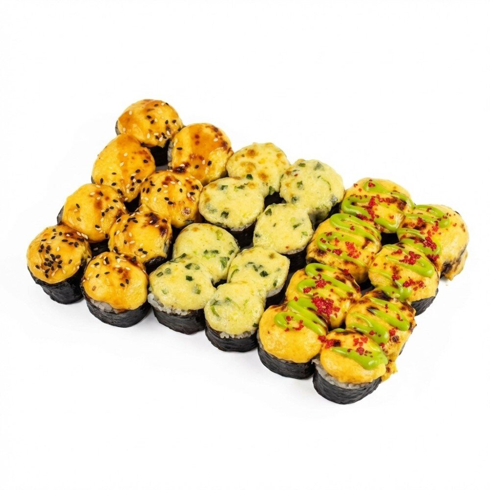 Состав : Запеченный с крабом , запеченный с лососем , запеченный с курицей