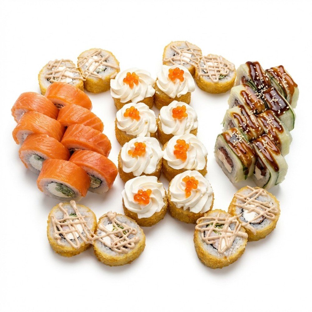 Состав: Фила с огурцом, Император с курочкой, Фила грин с лососем , Делюкс темпура с лососем