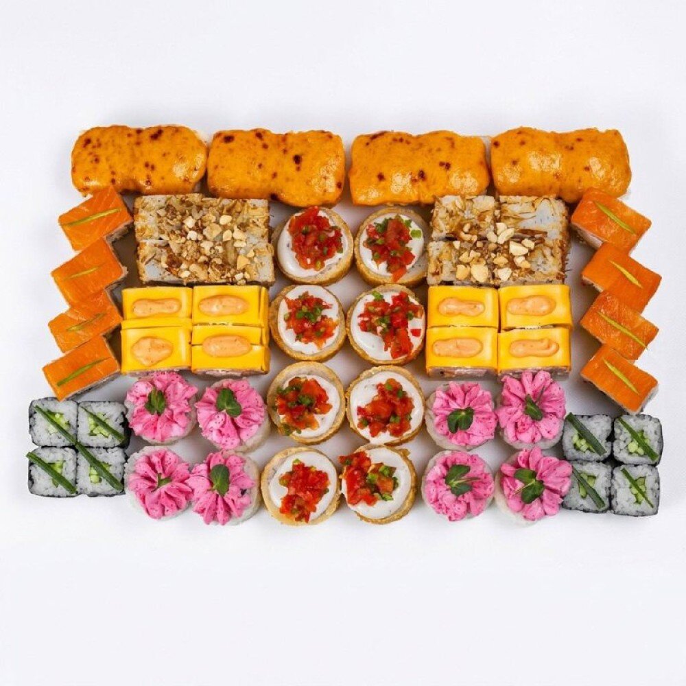 Состав: Фила лайт с огурцом, Лава с лососем, Каппа маки, Запеченный с лососем , Бонито с лососем, Чеддер с курицей, Цезарь темпура